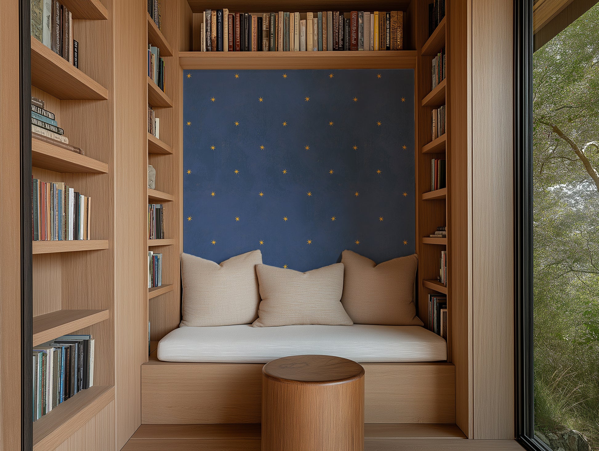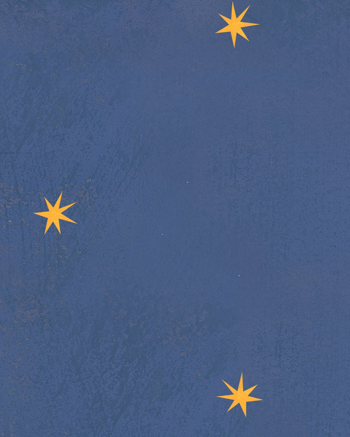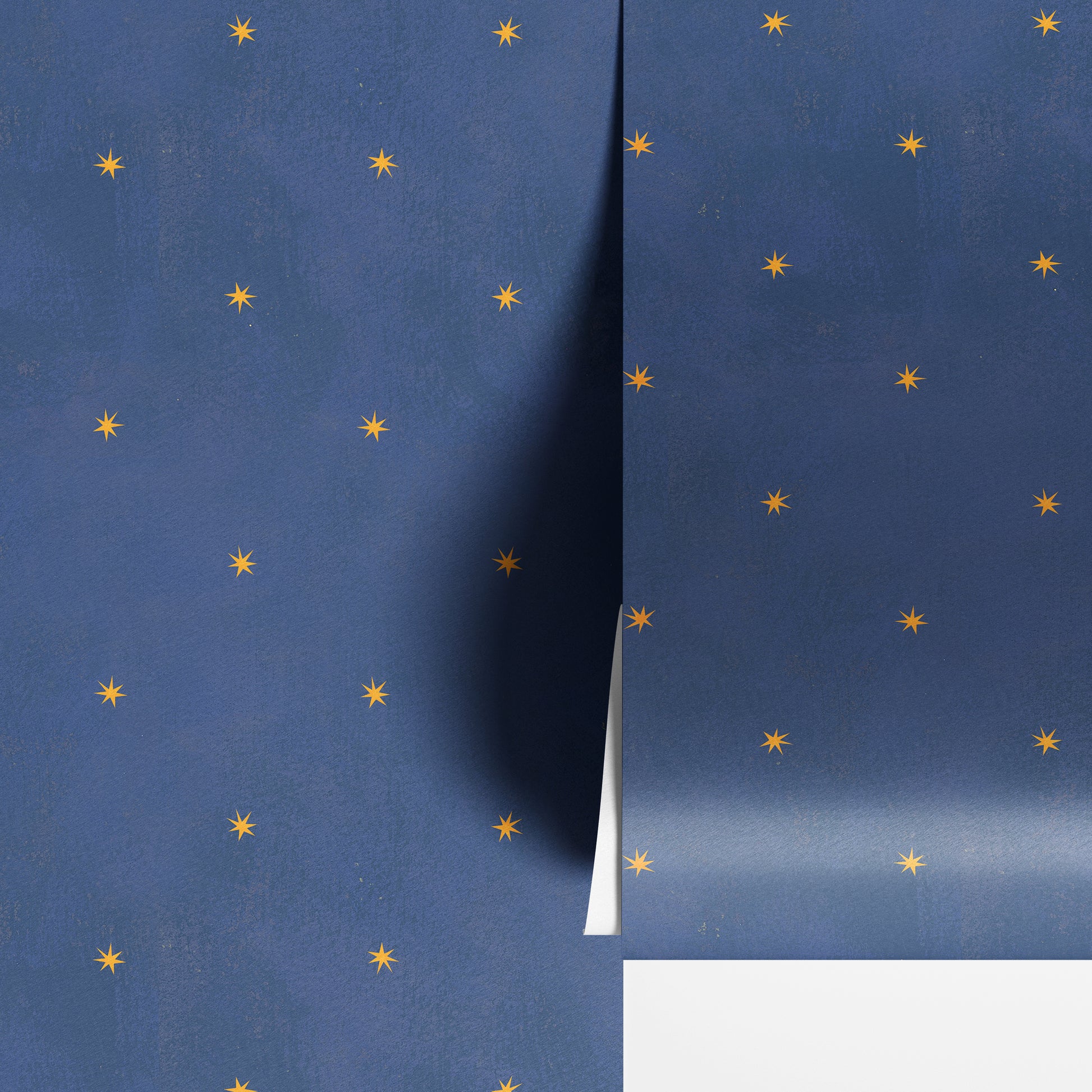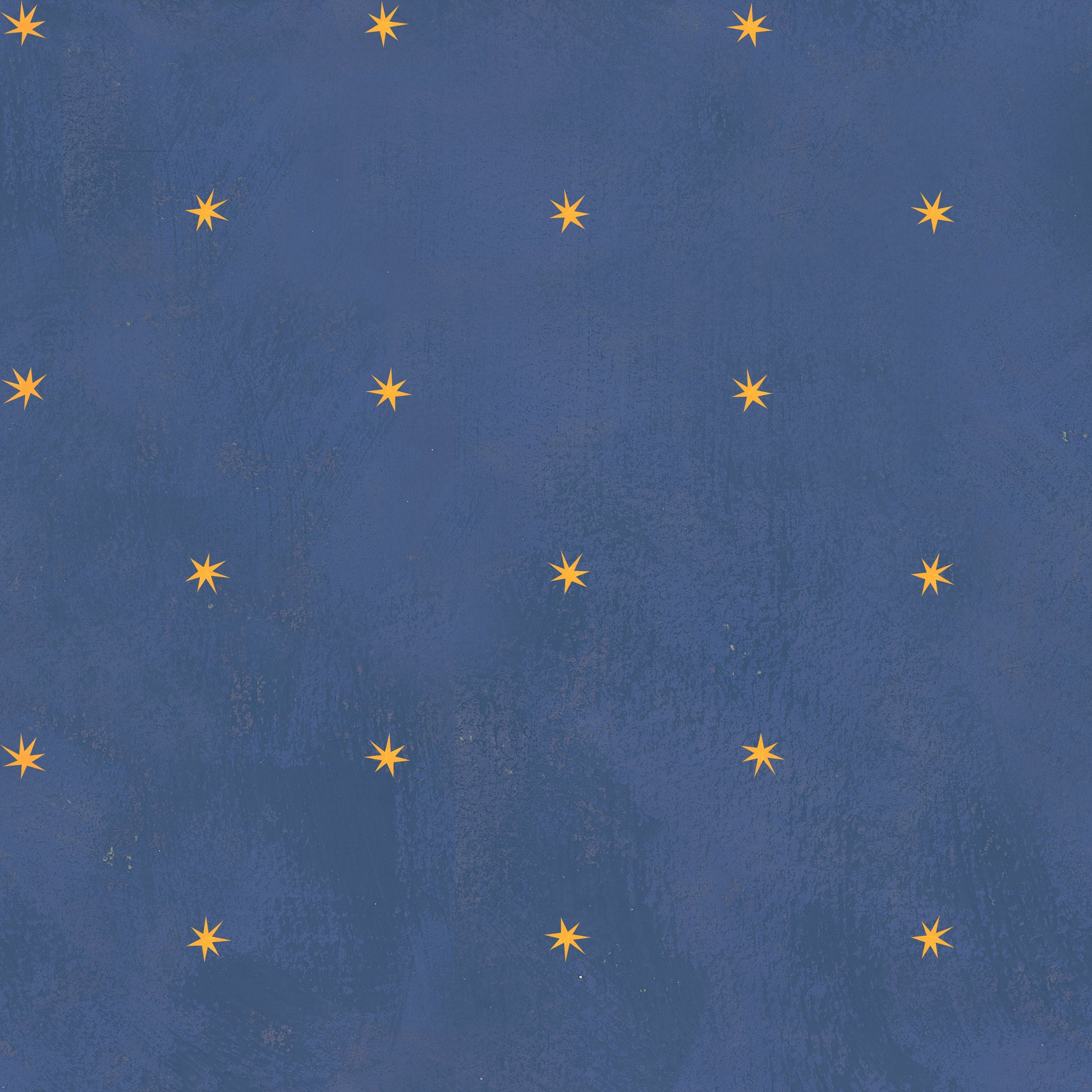 Dusk blue wallpaper with irregular yellow painted stars and a hand painted lime wash effect background. This dreamy night sky adds bold charm to an eclectic space. 24" repeat. Removable peel and stick and traditional wallpaper application options available.