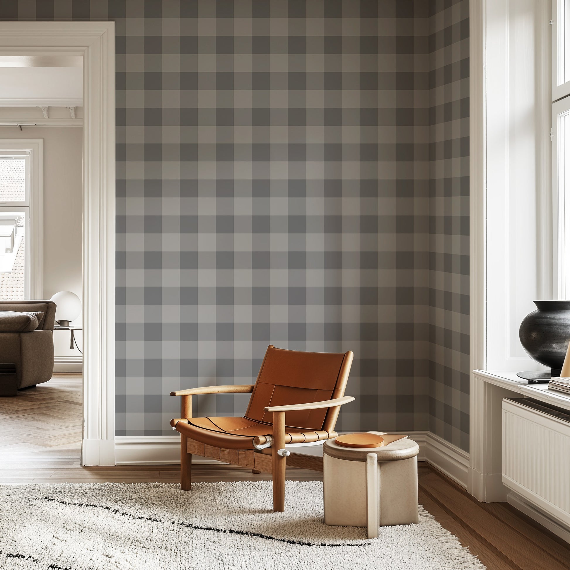 A classic 3 inch checked plaid pattern in dark and light grey. This traditional pattern works well paired with other small scale patterns and stripes. Removable peel and stick and traditional wallpaper application options available.