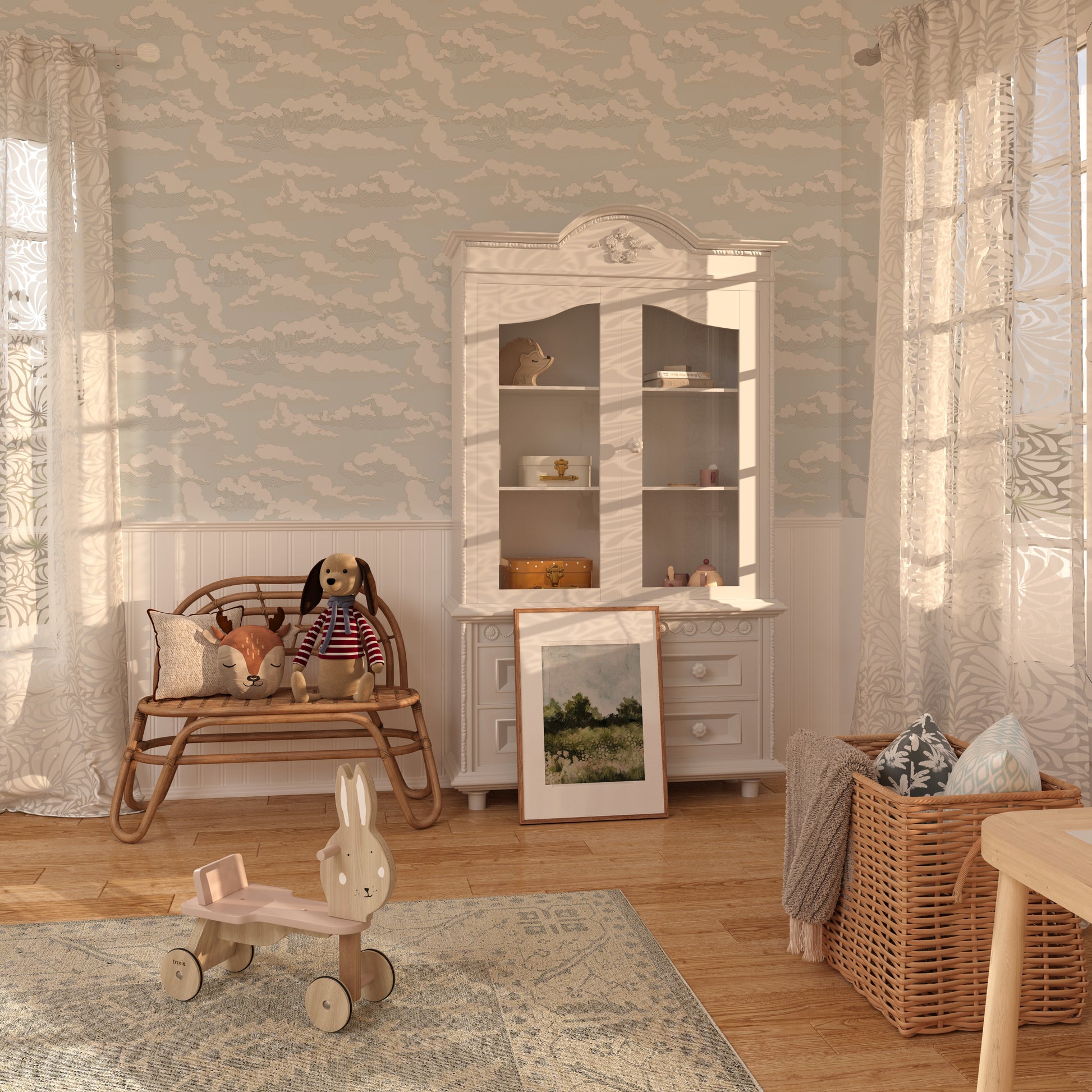 Soft, dreamy clouds drift across a pale sky in this hand drawn, pencil sketched print. Cumulus brings a playful sense of wonder to children's spaces. Perfect for storytime corners, nurseries, bedrooms, or anywhere you want a little imagination in the air. The organic lines and subtle texture give the pattern a calm, illustrated feel that grown with your child. Create a room that feels light, cozy, and full of imagination.