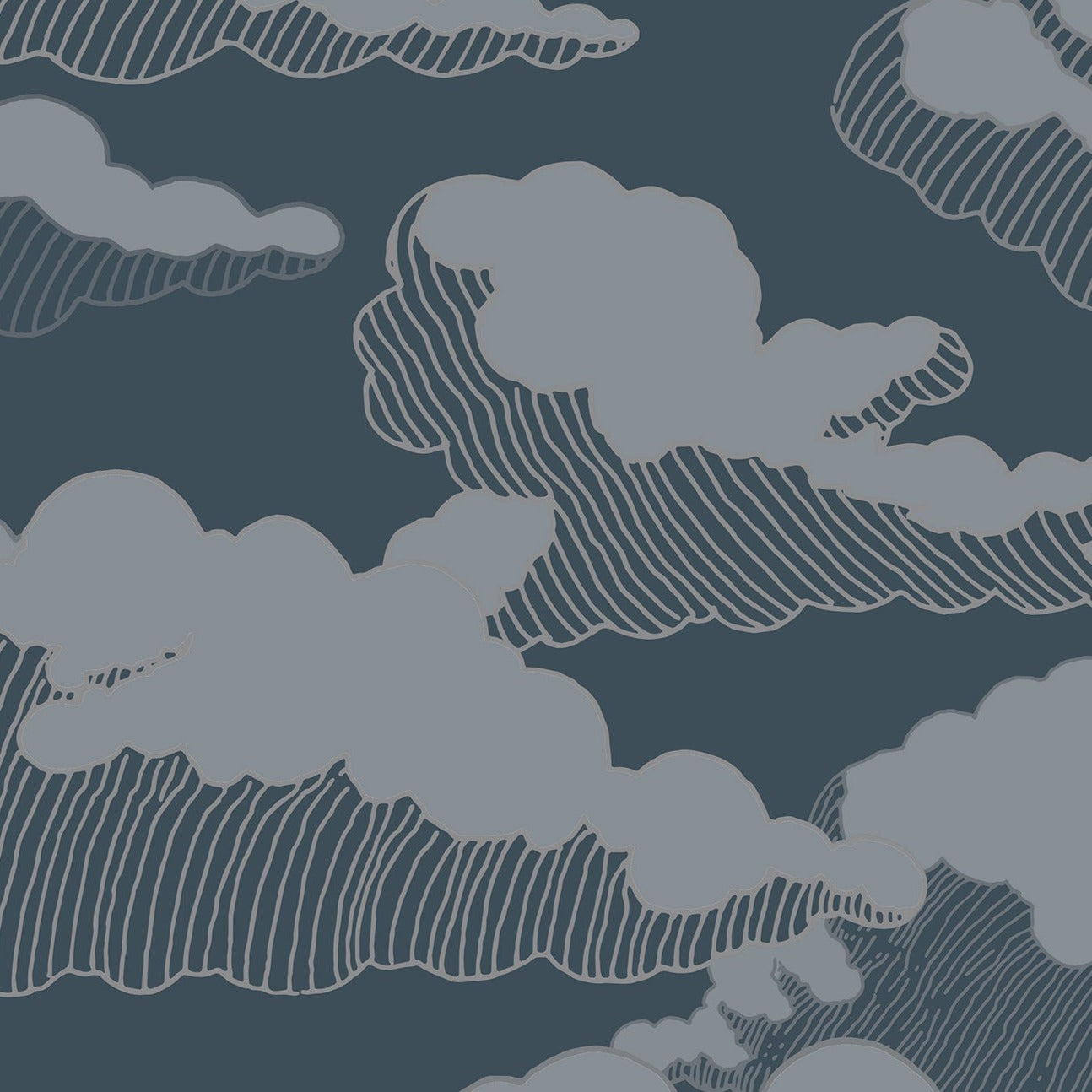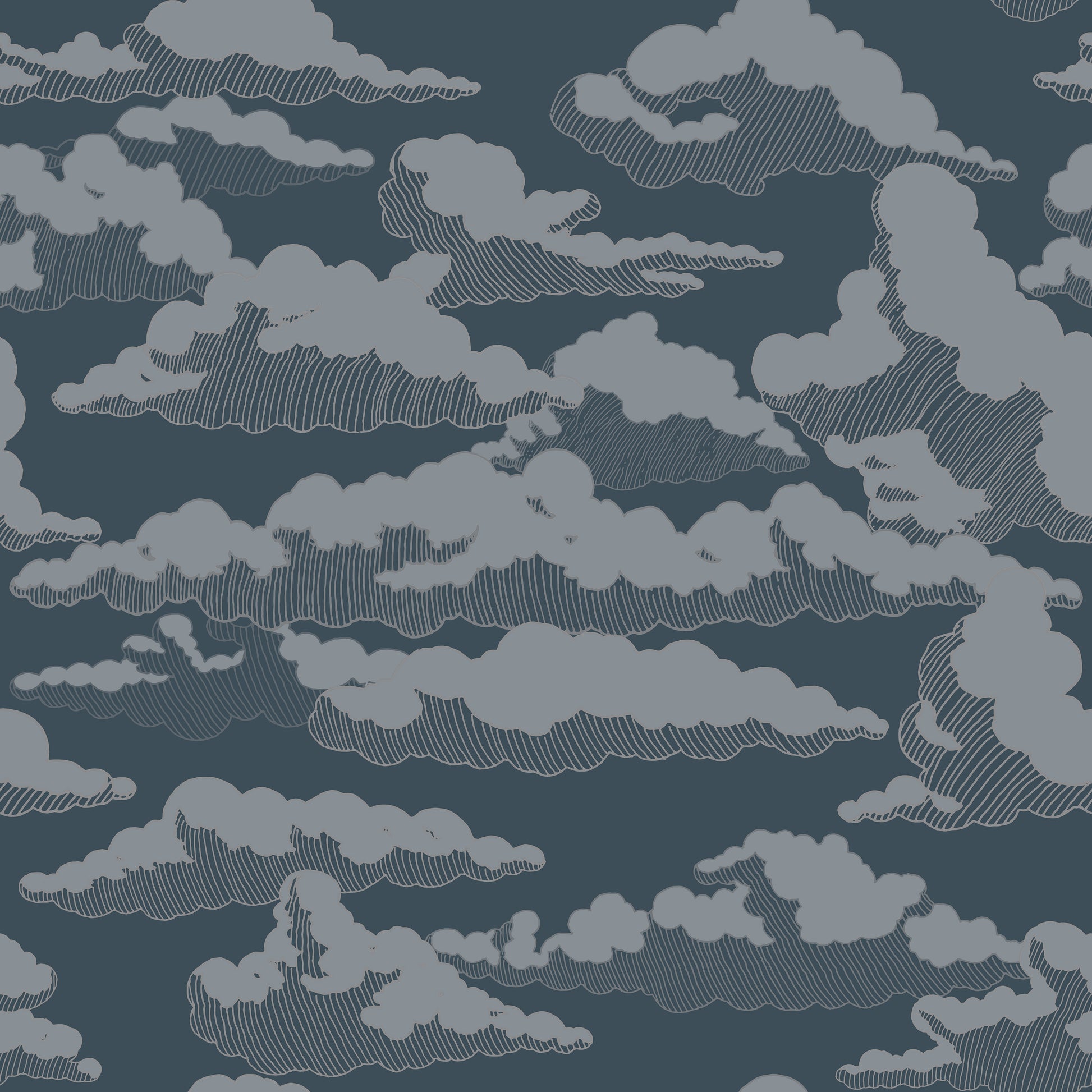 Dark blue and gray hand drawn cloud wallpaper. Each cloud is pencil sketched and colorized to adds bold charm to an eclectic space, and looks especially fun in a nursery or kid's room. Large scale clouds, 24" repeat. Removable peel and stick and traditional wallpaper application options available.