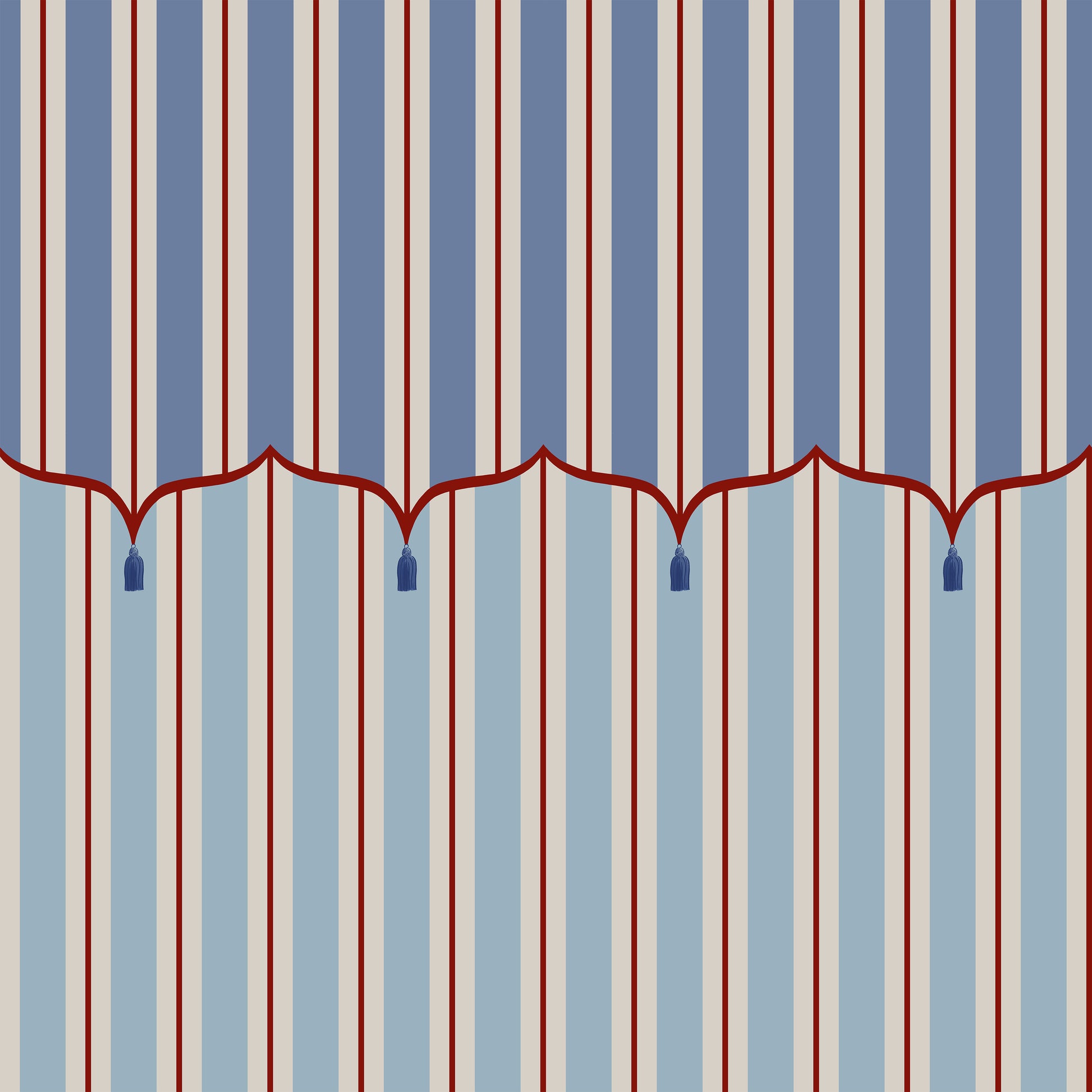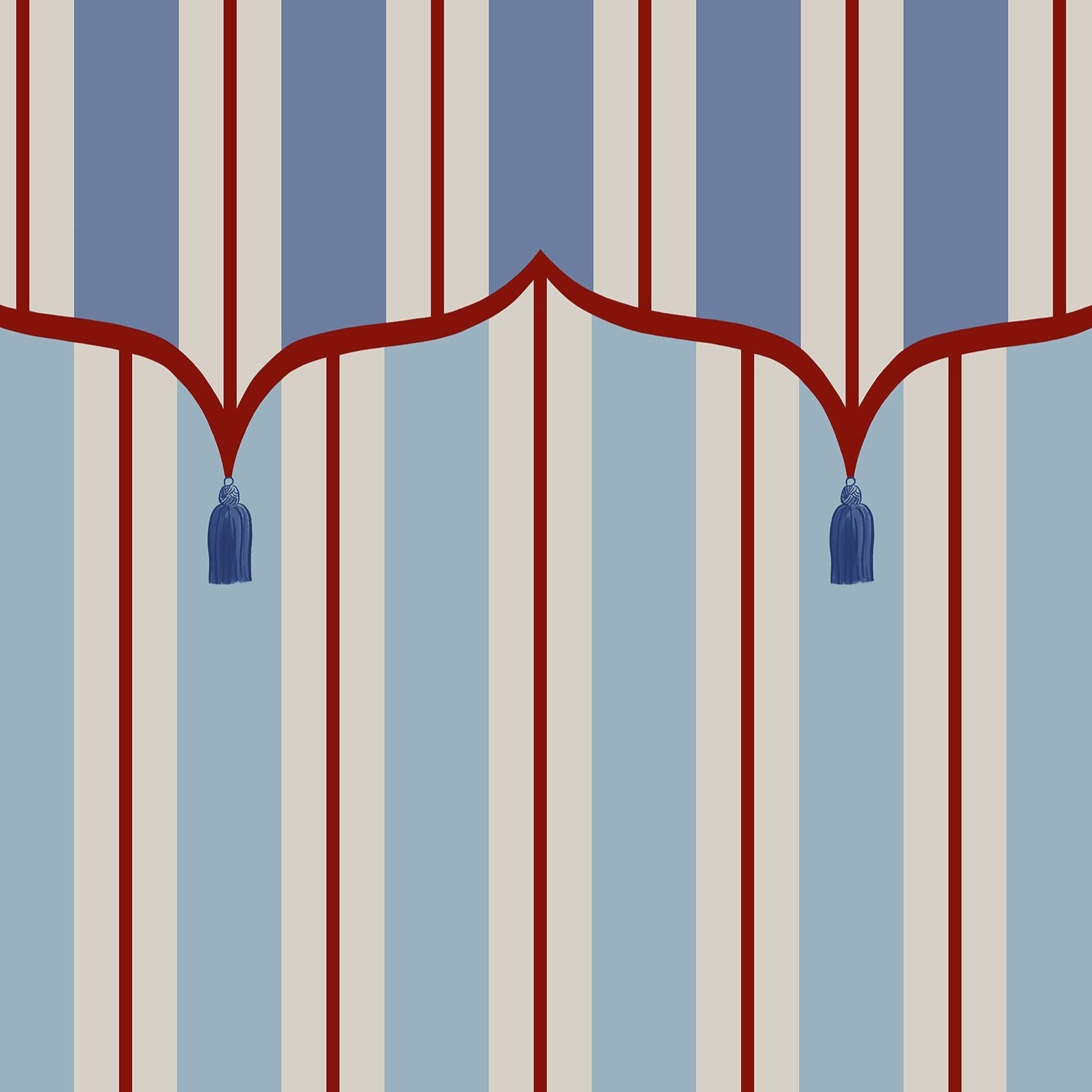 Step right up! Bring a touch of playful nostalgia to your space with our Funfair Tent Stripe wallpaper. Inspired by the charm of vintage fairgrounds, Funfair features bold stripes in dark red, light blue, and cream, topped with a whimsical scalloped border that recalls the joyful energy of carnival tents.