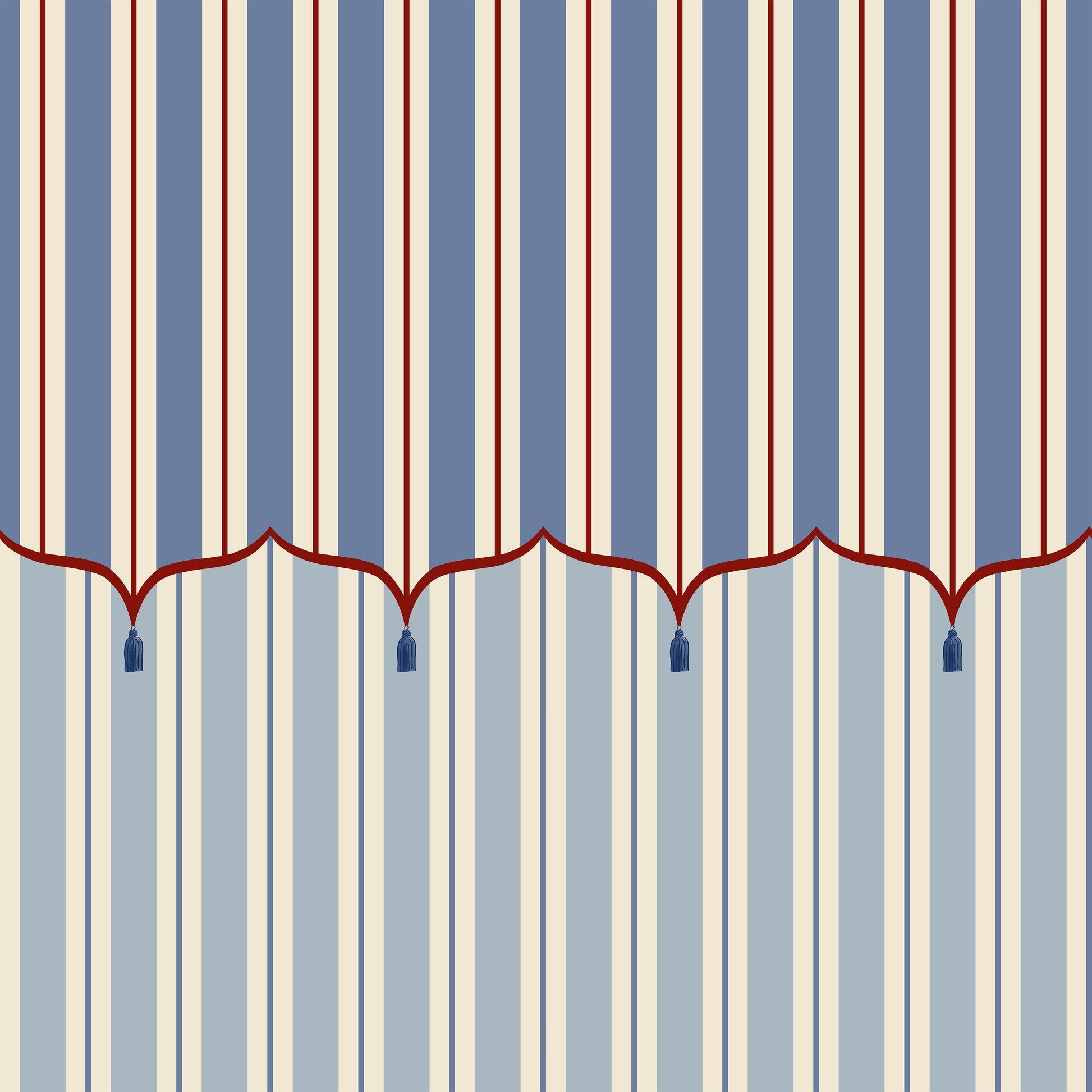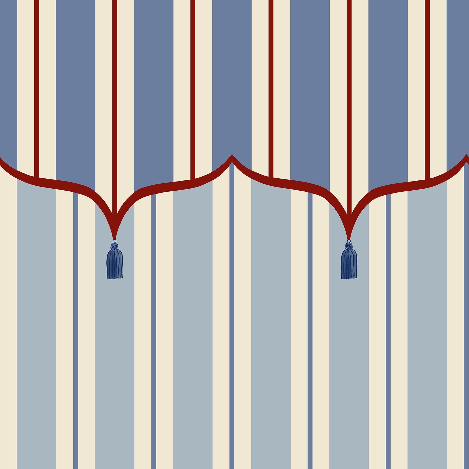 Step right up! Funfair Tent Stripe brings playful charm to your space with a whimsical take on a classic stripe. Bold stripes and hand drawn tassels in light blues, deep red, and cream pair with a scalloped border that recalls the joyful energy of carnival tents. Perfect for creating a room that feels whimsical and full of delight. Make every day feel like the main event.
