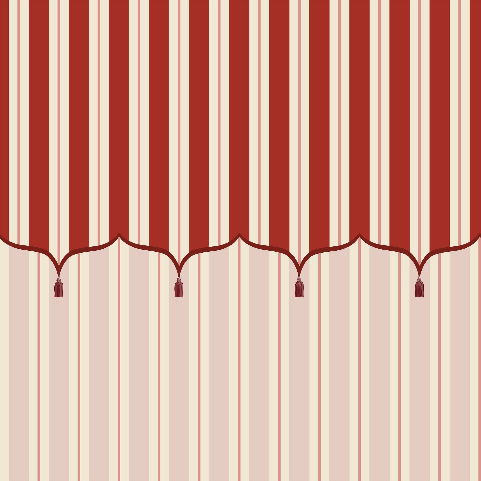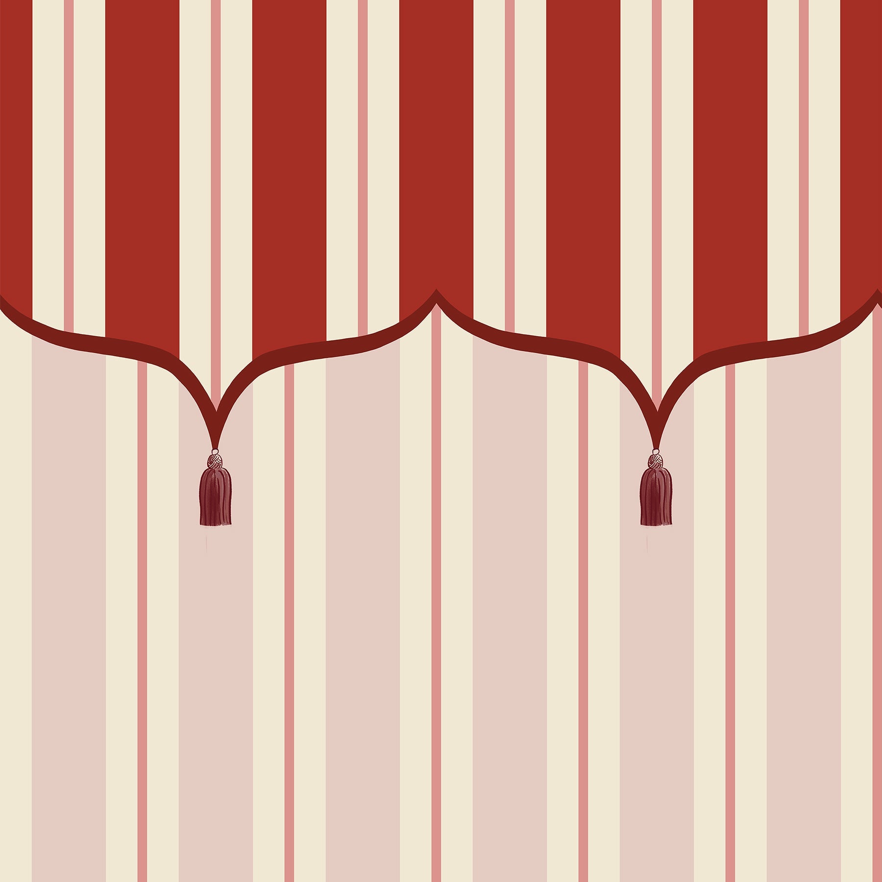 Step right up! Funfair Tent Stripe brings playful charm to your space with a whimsical take on a classic stripe. Bold stripes and hand drawn tassels in warm red, blush pink, and cream pair with a scalloped border that recalls the joyful energy of carnival tents. Perfect for creating a room that feels whimsical and full of delight. Make every day feel like the main event.