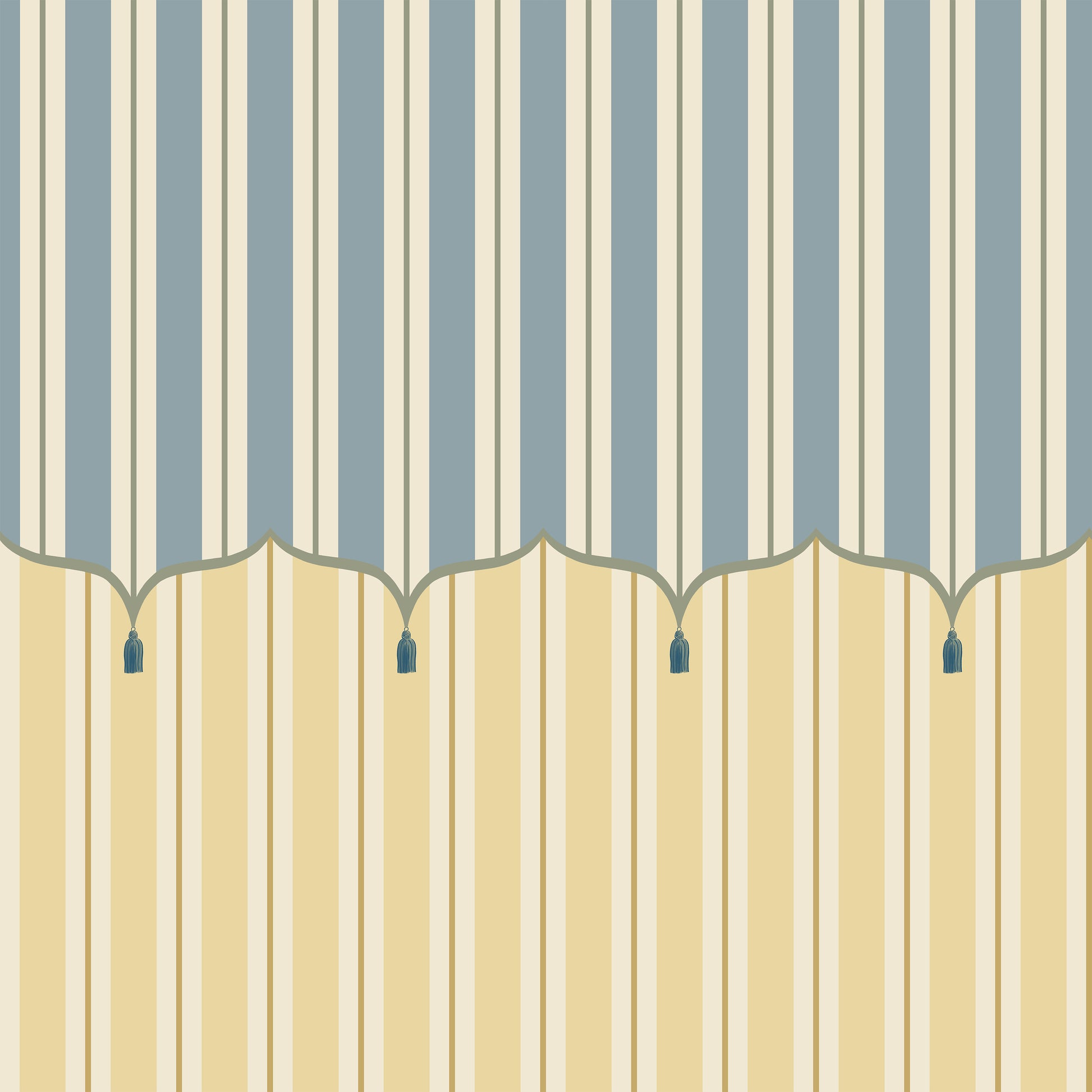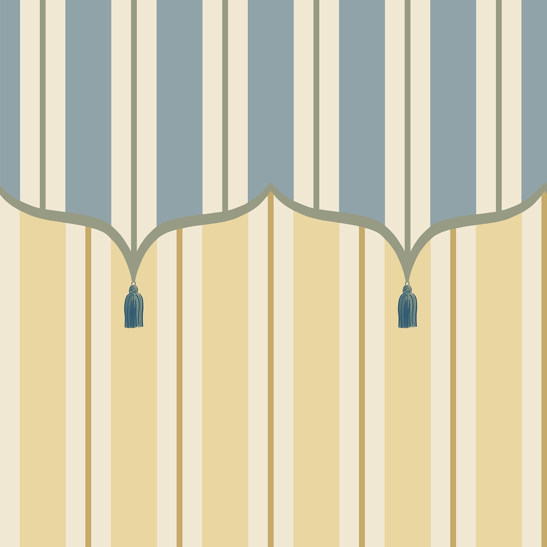 Step right up! Funfair Tent Stripe brings playful charm to your space with a whimsical take on a classic stripe. Bold stripes and hand drawn tassels in light blue, yellow, sage, and cream pair with a scalloped border that recalls the joyful energy of carnival tents. Perfect for creating a room that feels whimsical and full of delight. Make every day feel like the main event.