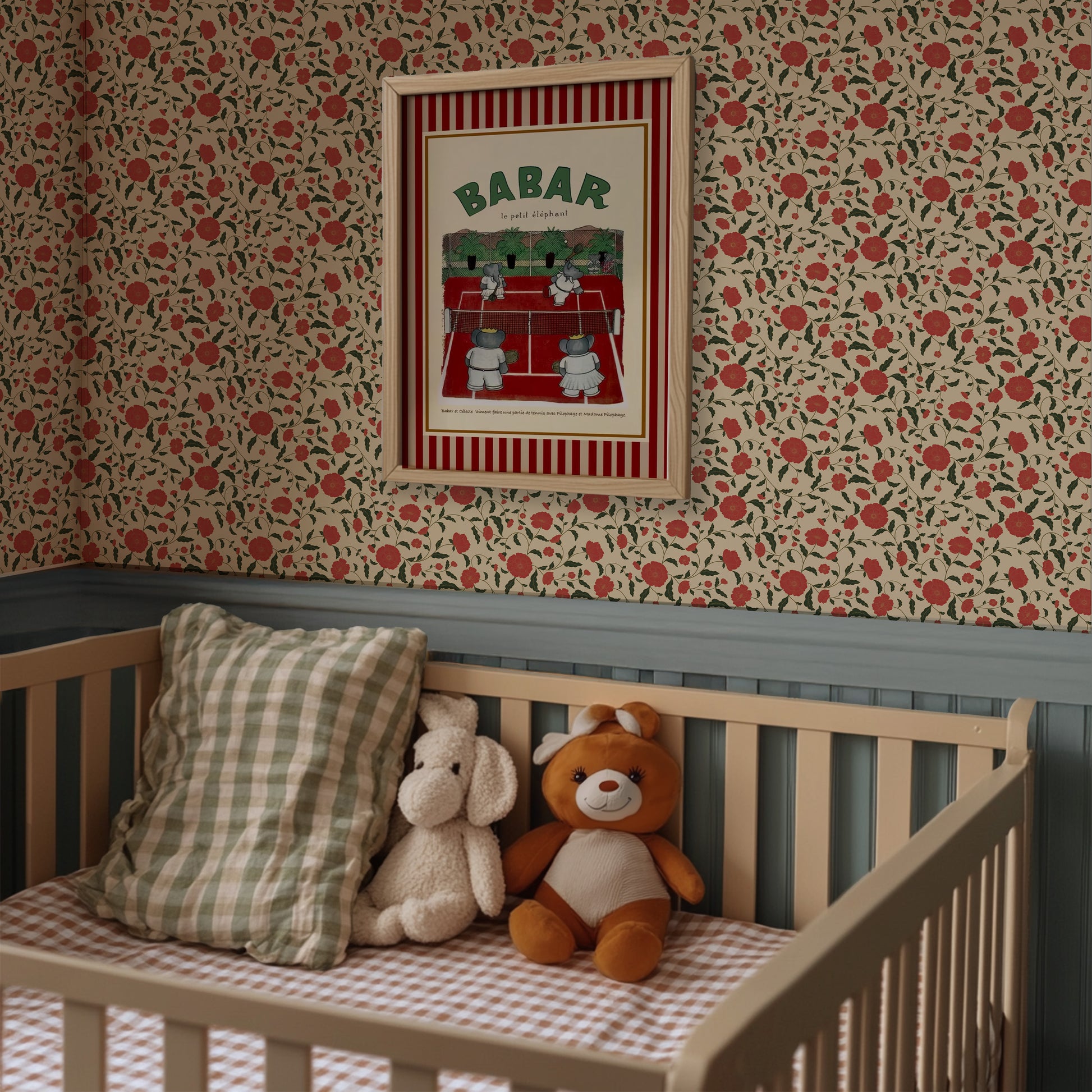 A bold floral with timeless charm. Louise features hand drawn red blossoms and deep green leaves scattered across a warm, neutral backdrop. The dense, flowing pattern creates a rich, vintage inspired look. Classic, cozy, and full of personality.