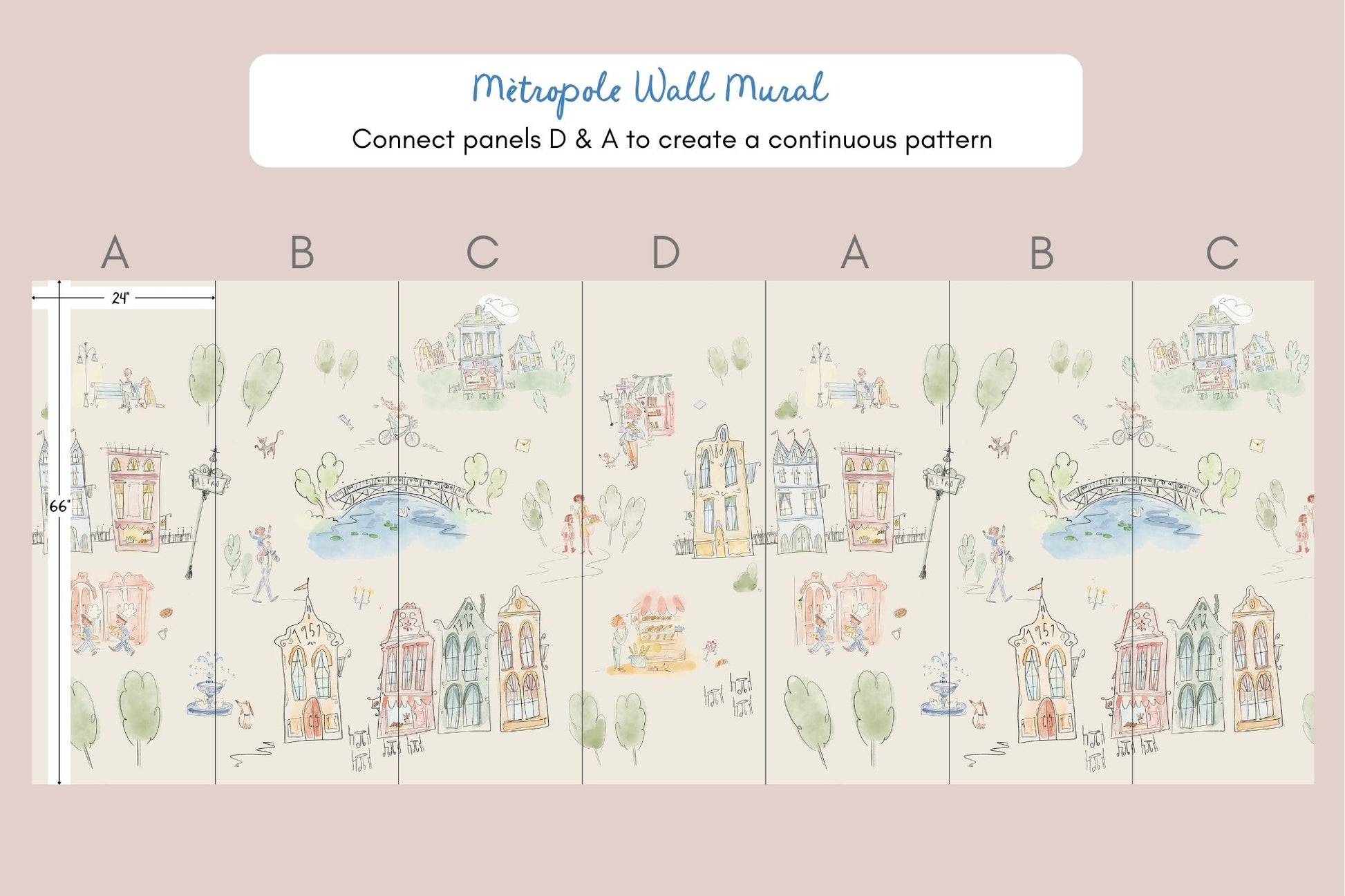 The complete mural is made up of 4 panels. Each panel is 24" wide (61cm). You may repeat the mural for more wall coverage. To do so, add multiples of the panels you'd like to repeat to your cart (for example, two of panel A).