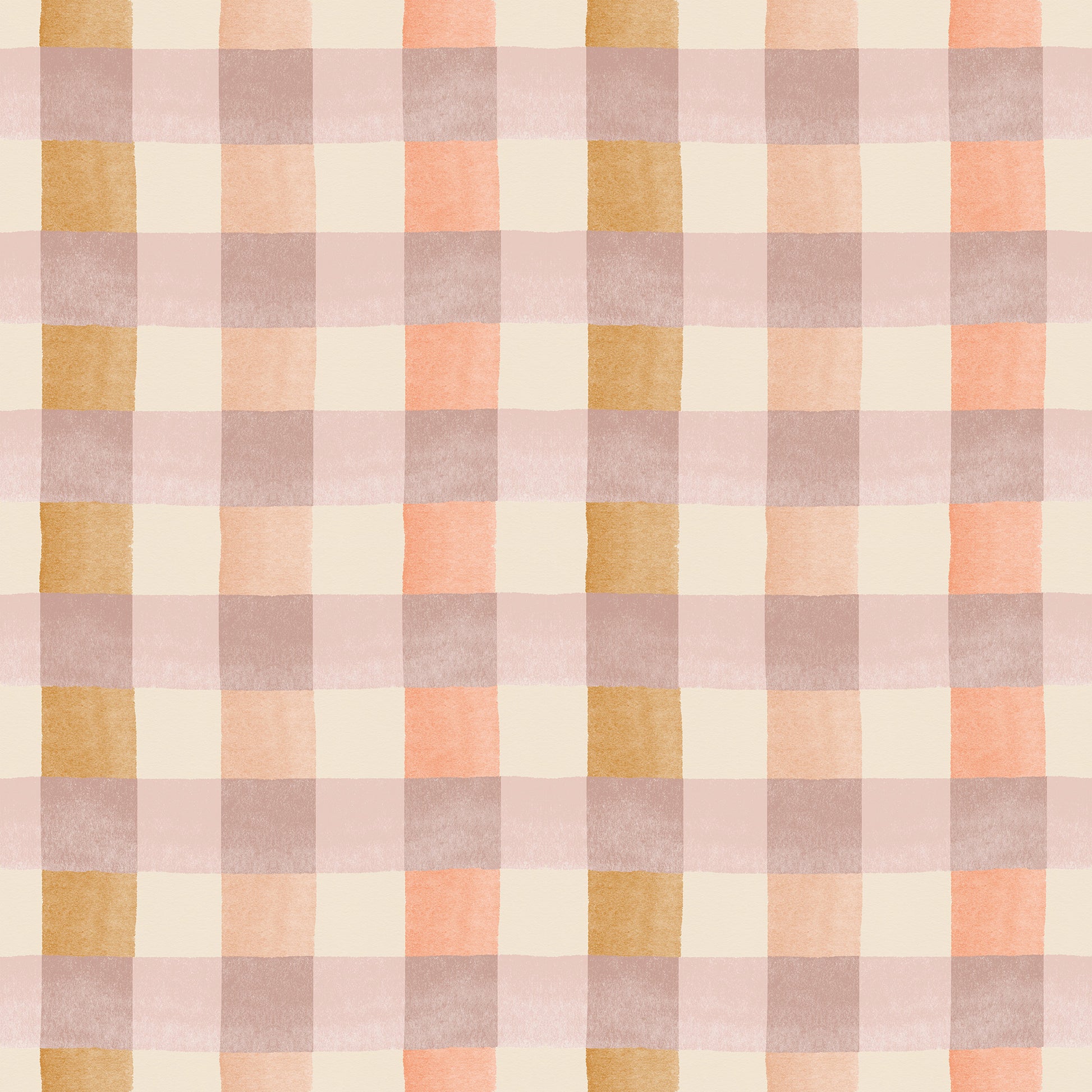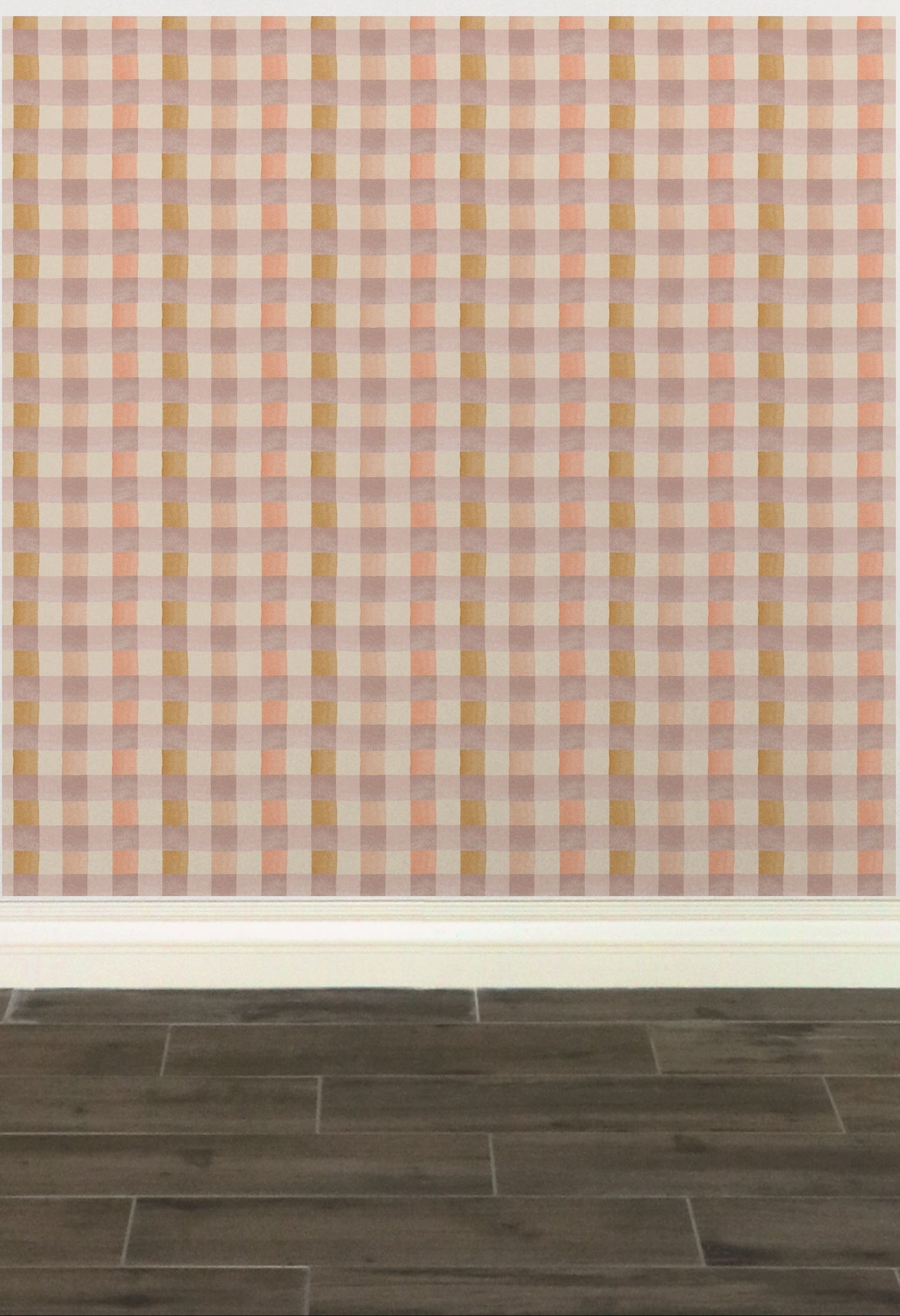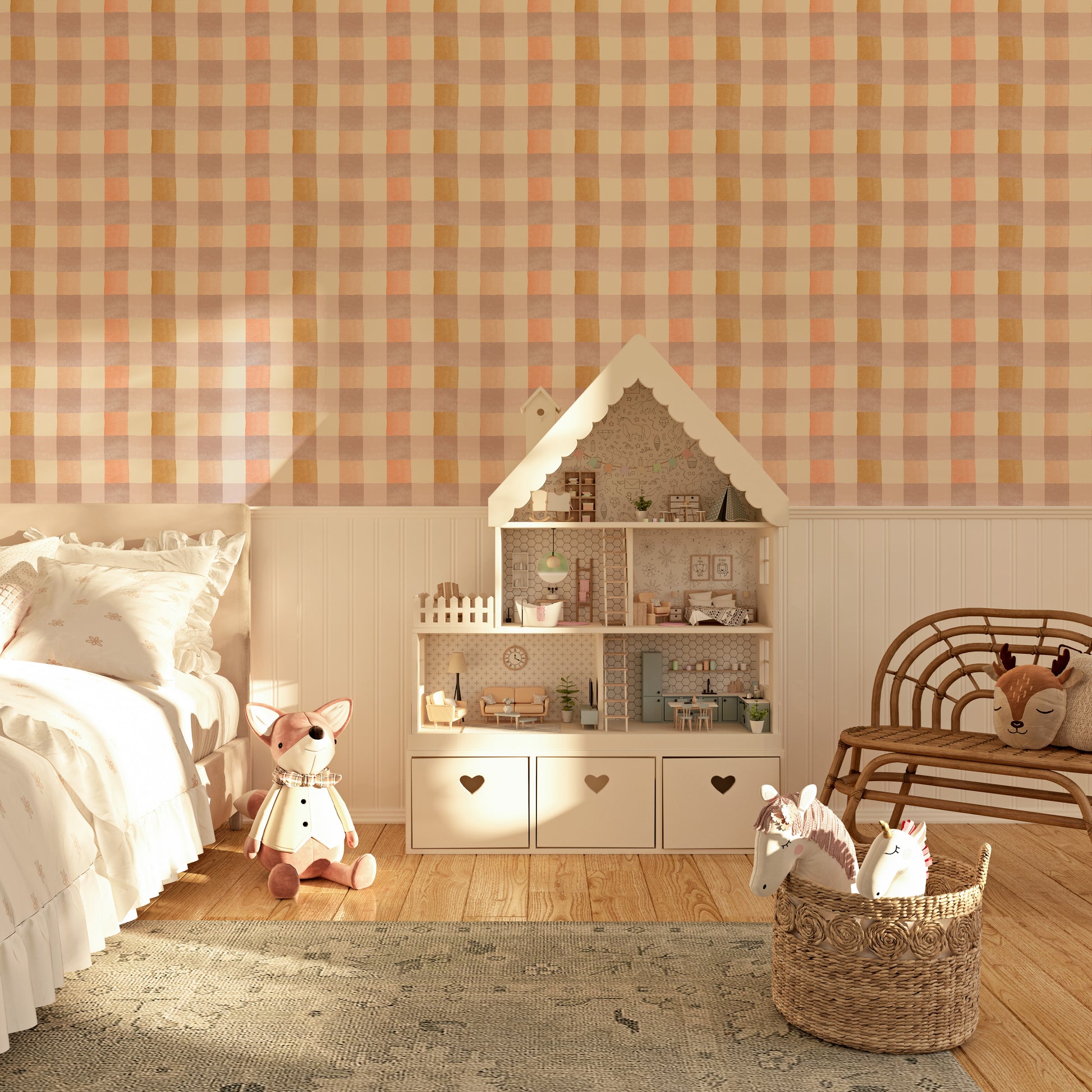 Warm blush pink, cream, mustard yellow and purple checked wallpaper. A traditional pattern with a hand-made feel that looks great combined with other prints. The watercolor pattern looks especially sweet in a nursery or kid's room.