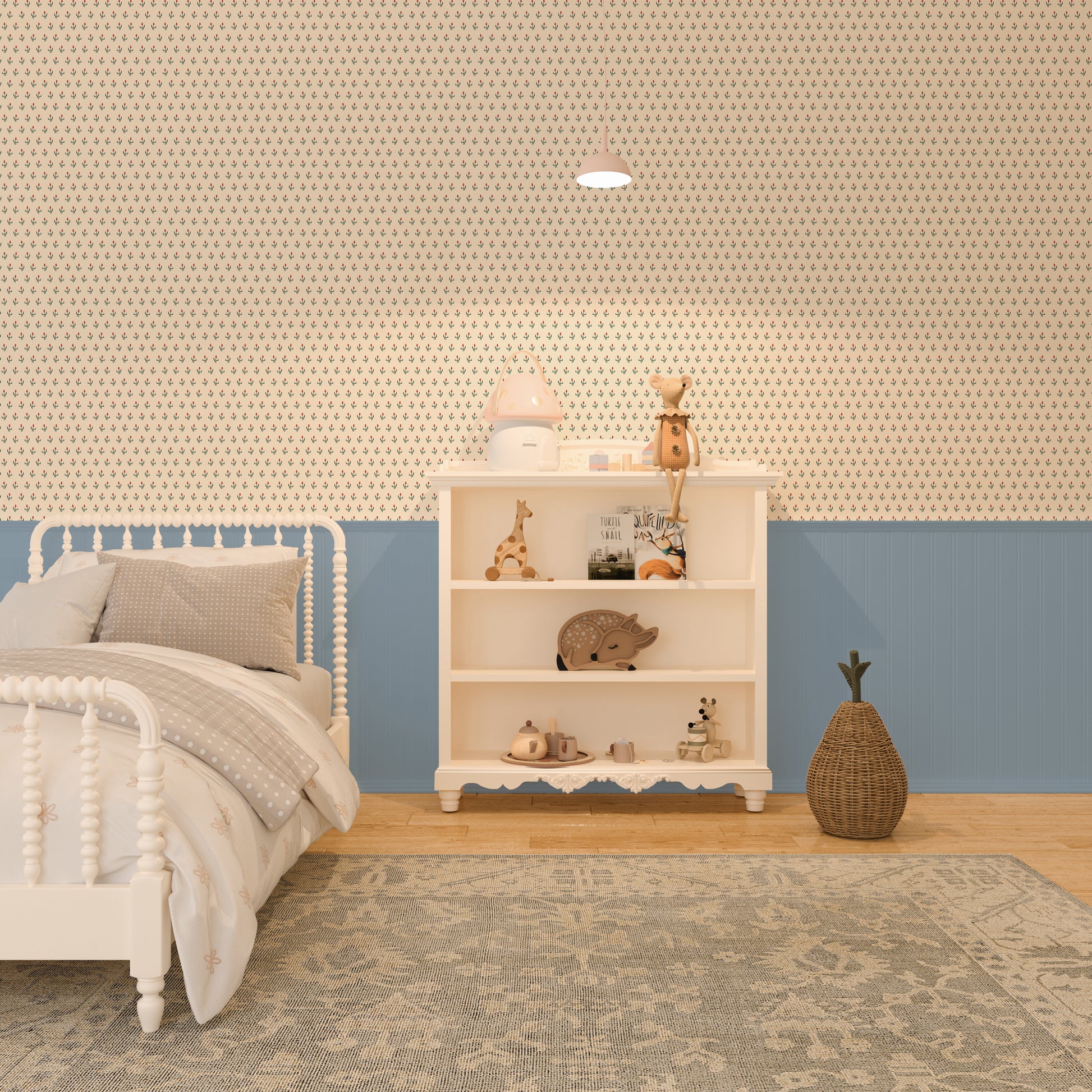 A field of tiny hand-painted tulips, scattered across a warm white backdrop. Painterly Tulip brings a sweet, classic charm to children's spaces. Think cottage florals, heirloom books, and sunlit playrooms. Its small scale print feels soft and timeless, making it especially lovely in nurseries, bedrooms, or cozy reading nooks. Create a room that feels loved, lived-in, and artfully classic.