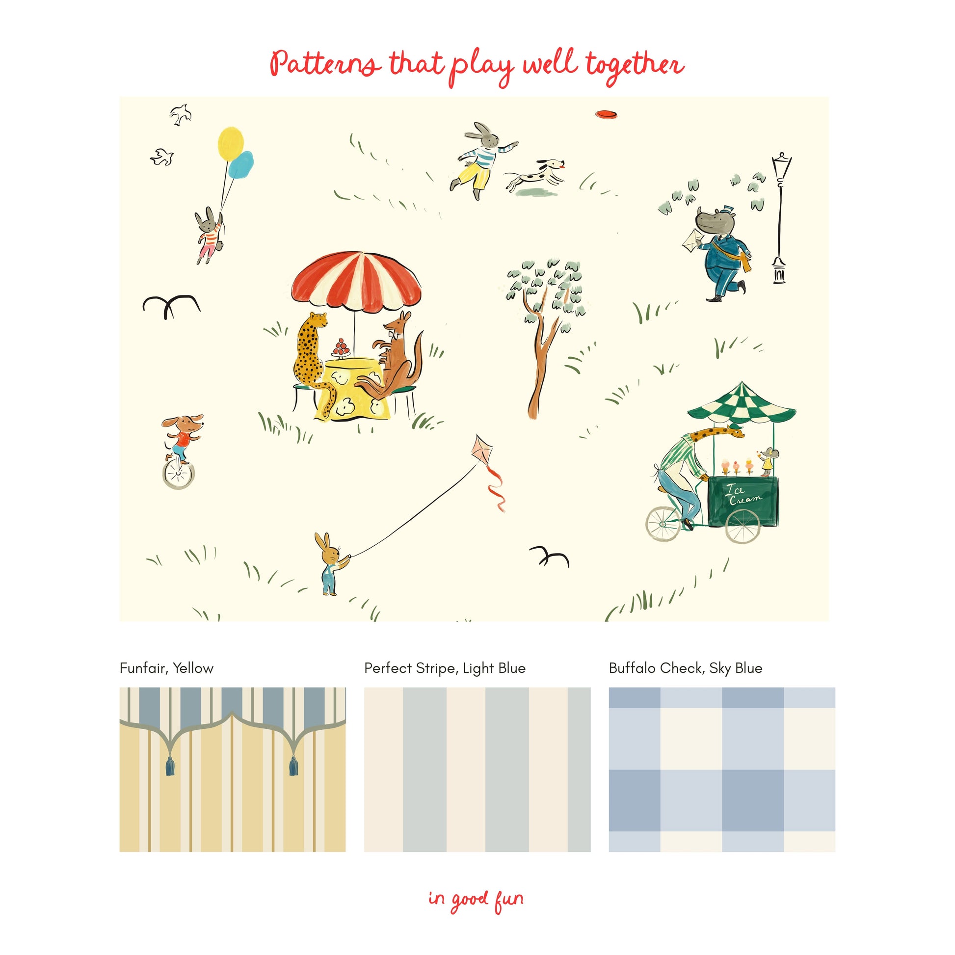 A day at the park, illustrated in the most charming detail. Parks is a collaboration from In Good Fun and illustrator Heidi de Leon of Hello Lucie Co., featuring whimsical animal friends picnicking, kite flying, frisbee throwing, ice cream eating, unicycling, and enjoying their lovely day at the park. The Parks pattern is full of movement and cheer, imagination, charm, and childhood magic.