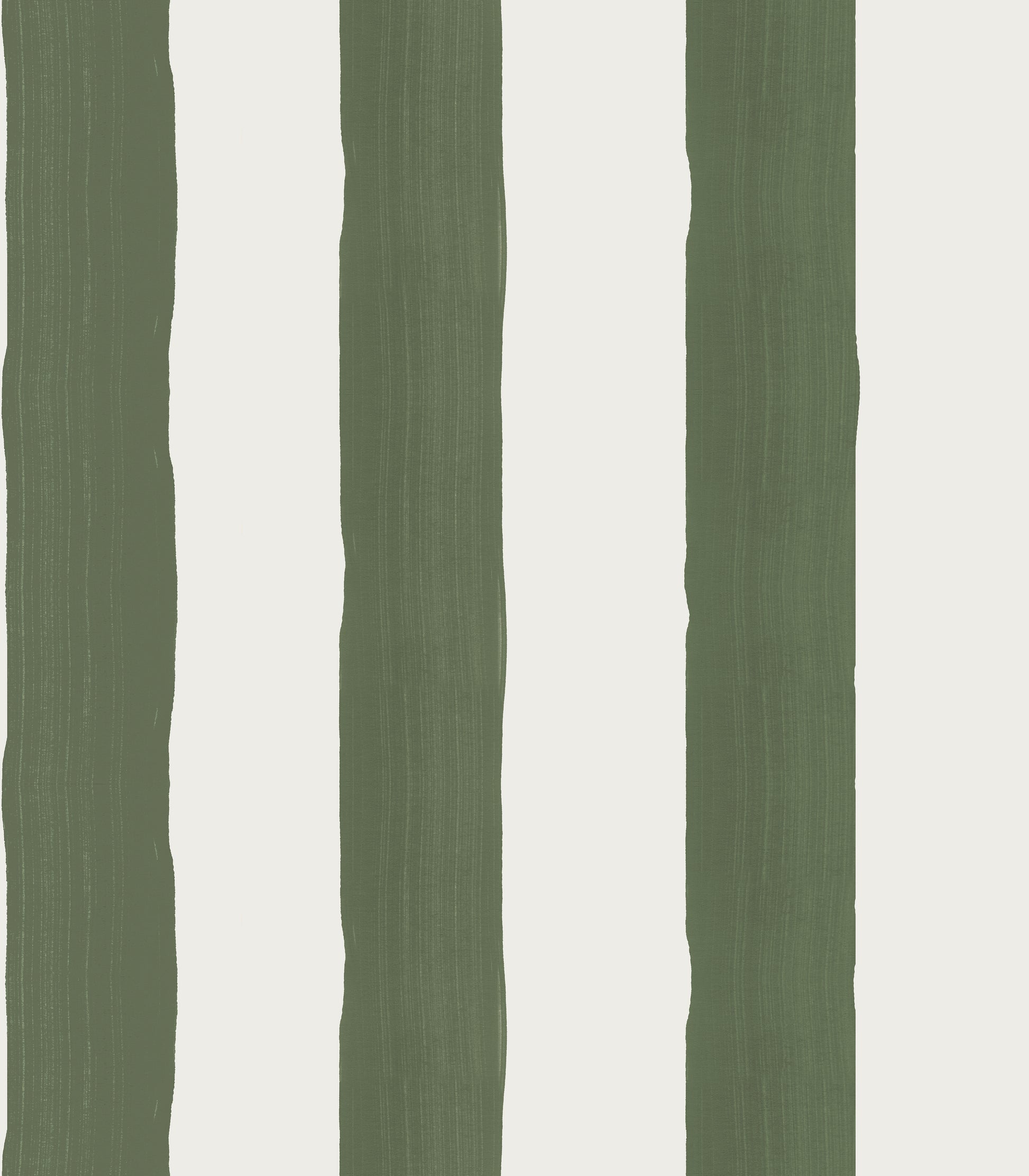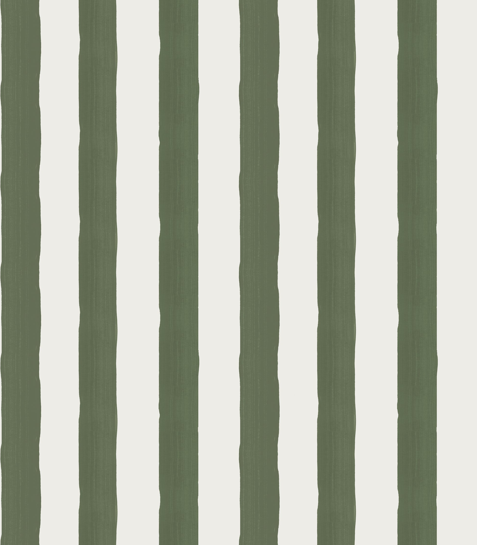An elevated olive green and white stripe painted in the most perfectly imperfect way. This stripe adds a classic but playful touch to any space. It looks especially great mixed with other patterns for a not-too stuffy traditional look. Removable peel and stick, pre-pasted, and traditional wallpaper application options available.